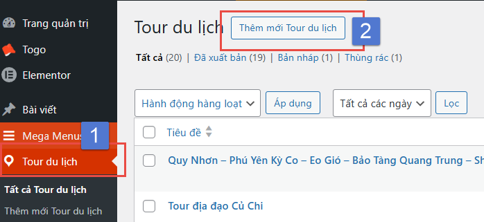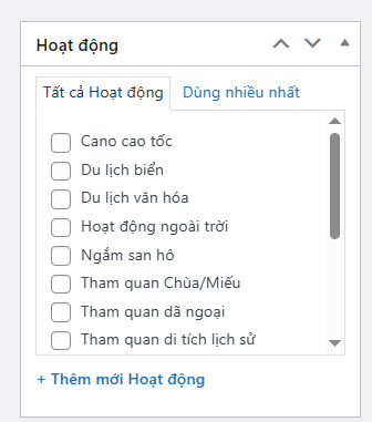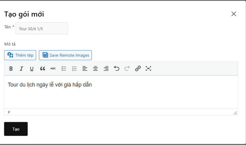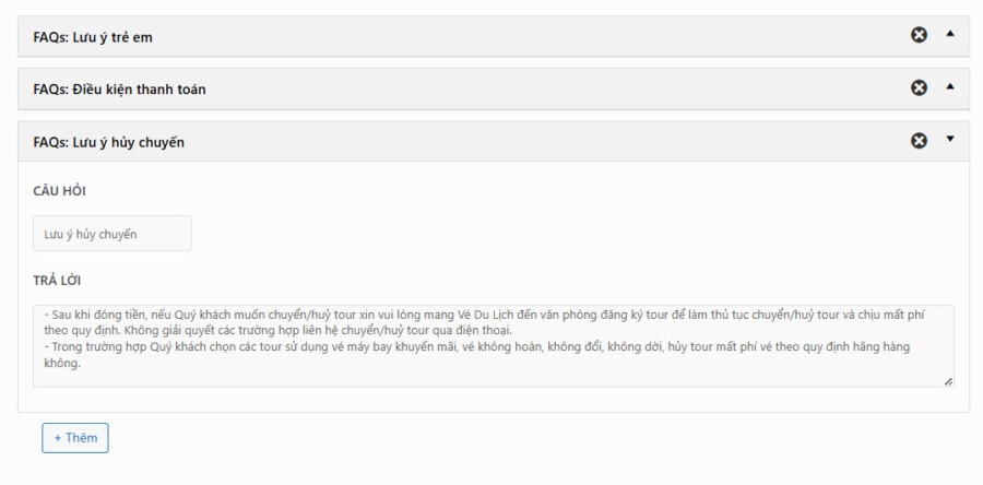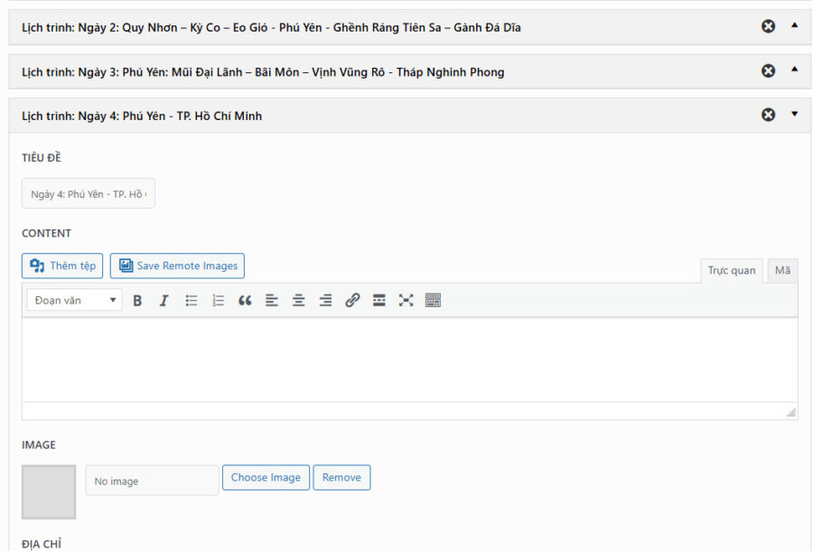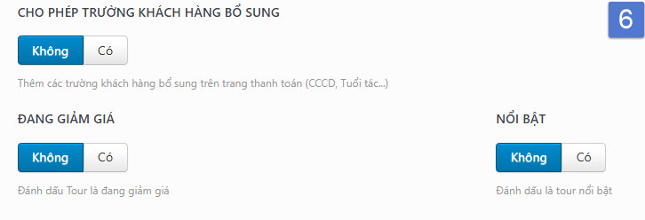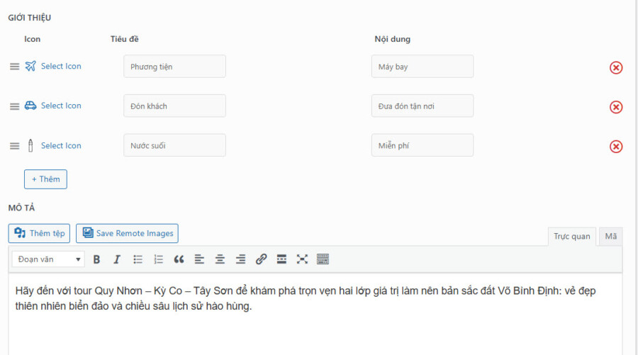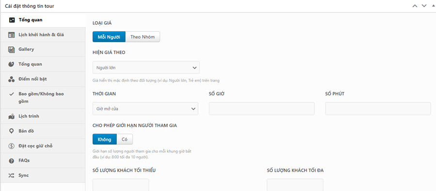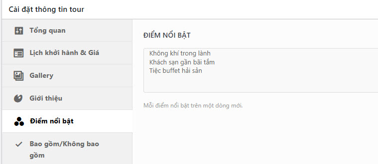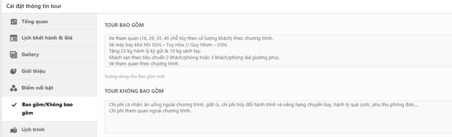 Hướng dẫn tổng hợp Hướng dẫn đăng tour du lịch 36 Mục lục Bước 1: Vào Tour du lịch -> Thêm mới Bước 2: Nhập tên tour Bước 3: Nhập các thông tin lọc Các thông tin cơ bản để khách hàng có thể tìm kiếm dễ hơn. Các mục lựa chọn đều có thể được bổ sung thêm tùy nhu cầu 1. Ảnh đại diện => Đặt ảnh đại diện 2. Giá theo đối tượng Chọn đối tượng bán tour (Người lớn / Trẻ em) 3. Điểm đến Chọn điểm đến. Nếu điểm đến là Đà Nẵng, nên chọn cả 3 mục Trong nước | Miền Trung | Đà Nẵng 4. Hoạt động Các hoạt động nổi bật của tour 5. Loại tour 6. Thời gian tour (Ngày / Đêm) 7. Thời gian trong ngày (giờ/phút) 8. Ngôn ngữ HDV HDV có thể sử dụng ngôn ngữ nào trong chuyến đi 9. Dịch vụ thêm (Có thể thêm phí) Các dịch vụ thêm trong chuyến đi. Có thể nhập thêm phí cho dịch vụ để khách hàng thanh toán. Bước 4: Cài đặt thông tin chính 1. Tổng quan 1. Cách tính & hiển thị giá Cách tính giá: Chọn cách tính giá dựa trên người/ Trên nhómHiện giá theo: Giá sẽ hiển thị theo đối tượng (mặc định Người lớn) 2. Thời gian tour Nếu Tour dài ngày -> Nhập Số ngày/Số đêm (VD 4 ngày 3 đêm)Nếu Tour trong ngày: Nhập tổng thời gian chuyến đi (VD: 7 giờ 30 phút) 3. Quản lý số lượng khách Giới hạn Tổng số lượng khách đăng ký/TourNếu có giới hạn Tổng số luọng khách / tour -> Chọn có -> Nhập số kháchGiới hạn Số lượng khách đăng ký theo đối tượngCho phép thiết lập số khách tối thiểu và tối đa theo đối tượng. 4. Quản lý thời gian đăng ký Tour Nhập thời gian đăng ký & thời gian khóa sổ (Nếu có) 5. Các thông tin khác Bật có nếu tour đang giảm giá hoặc để hiển thị trong mục HOT & Giảm giá trang chủ 2. Lịch khởi hành & Giá 3. Gallery Thêm link Video (YouTube, Vimeo, MP4) nếu có. Nếu có video, bắt buộc cần nhập Ảnh Video làm ảnh bìa.Thư viện ảnh: Chọn tối thiểu 3 ảnh Tour. Giữ phím Ctrl để chọn nhiều ảnh cùng lúc 4. Giới thiệu Nhập Thông tin, giới thiệu ngắn về địa điểmKết quả: 5. Điểm nổi bật Thêm các điểm nổi bật. Mỗi dòng là 1 điểm nổi bật khác nhauKết quả: 6. Bao gồm/Không bao gồm Xuống dòng cho một thông tin mới 7. Lịch trình Nhập lịch trình chuyến đi: Chọn + Thêm -> Thêm tiêu đề/địa điểm & nội dung lịch trình 8. Bản đồ Nhập địa chỉ Điểm đón (hoặc điểm khởi hành) 9. Đặt cọc giữ chỗ Nếu cho phép đặt cọc, Chọn Có & Nhập tỷ lệ tiền cọc (mặc định 30%) 10. FAQ Nhập Các thông tin cần lưu ý trong chuyến đi